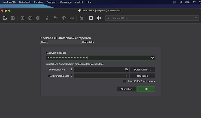 Nach Öffnen der App und Auswahl der passenden Datenbank, wird als erstes das Masterpasswort abgefragt. Anschließend hat man Zugriff auf die in der Datenbank gespeicherten Passwörter.