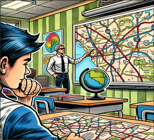 Quelle: S. Kirsch, Hintergrundbild kreiert mit DALL·E 2024-04-21 (Create a cartoon: a friendly teacher discusses with two students in a classroom with a world map.)