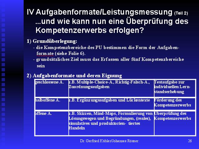 IV Aufgabenformate/Leistungsmessung (Teil 2) ...und wie kann nun eine Überprüfung des Kompetenzerwerbs erfolgen?