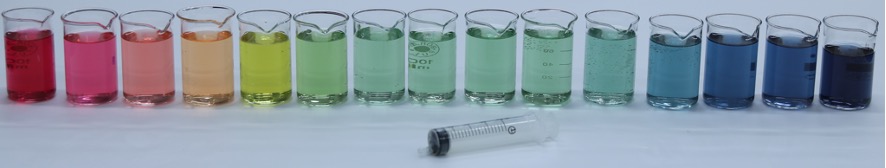 BGl 2-15 enthalten je 90 mL Leitungswasser mit einigen Tropfen Universalindikator Nun werden mit einer Spritze beginnend von BGl 1 je 10 mL in das nächste Becherglas überführt (bei zügigem Einspritzen ist kein Rühren nötig), bis Glas Nr. 15