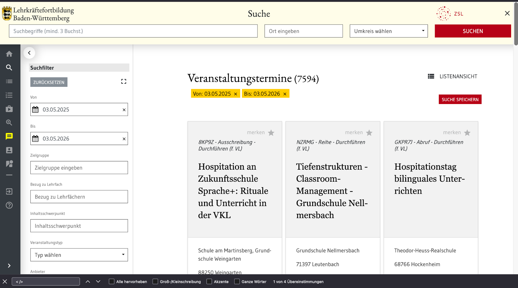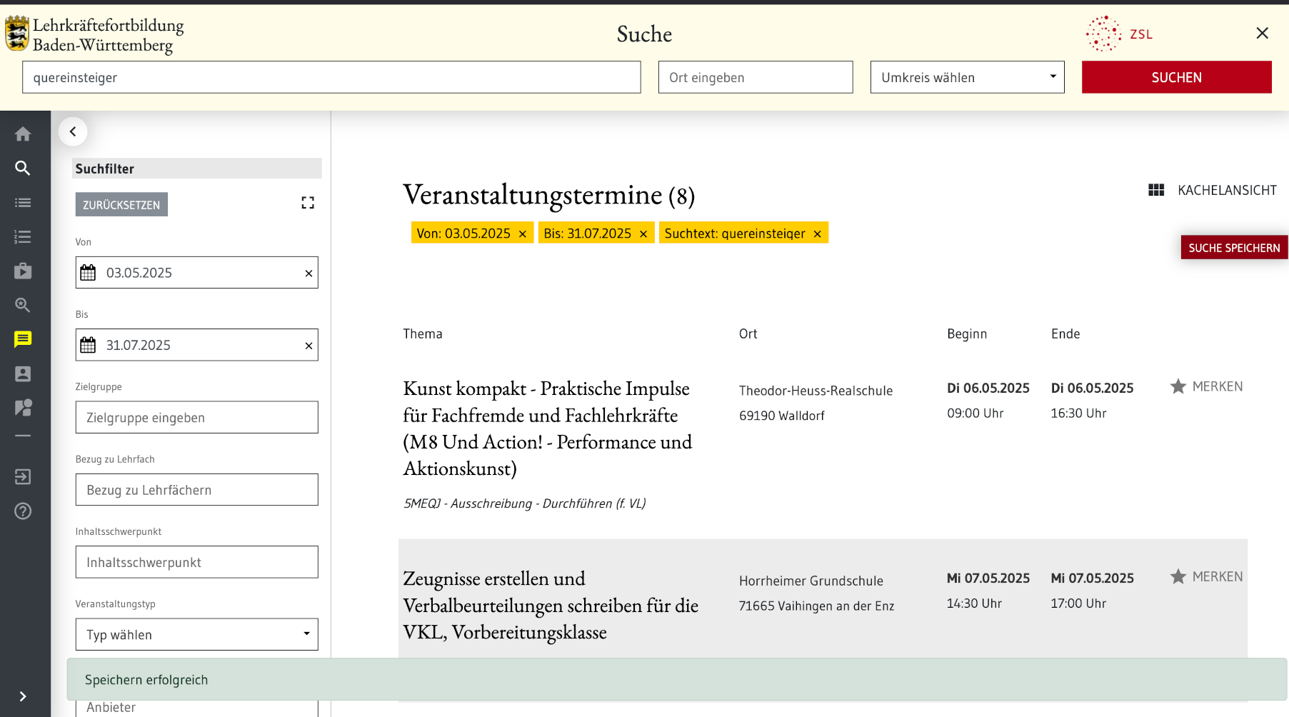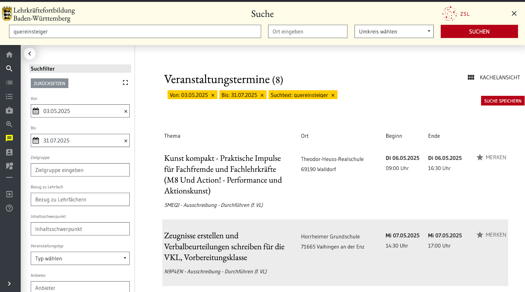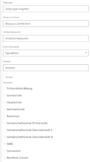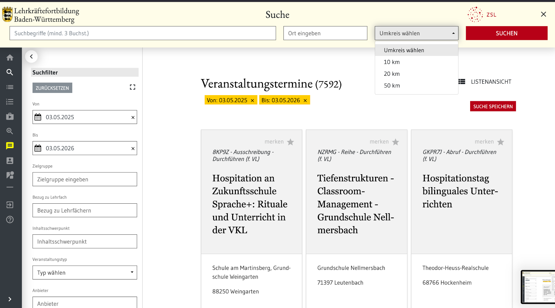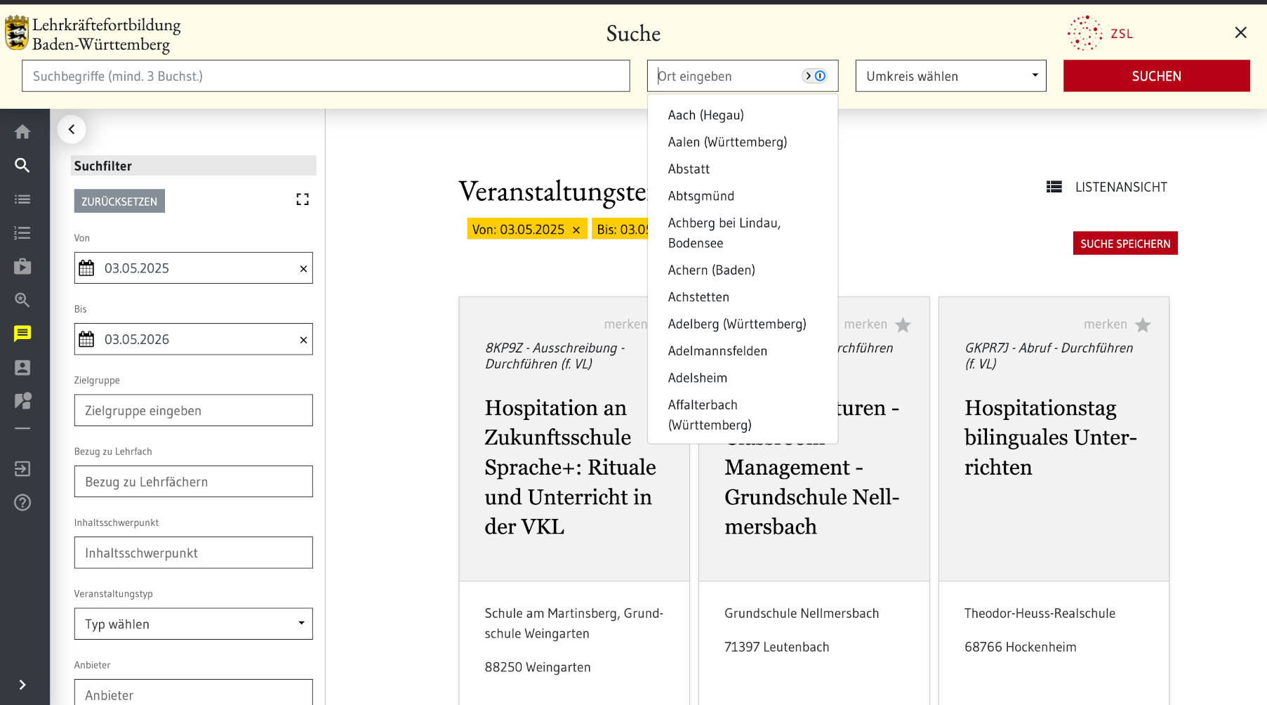 Über die Suchfunktion können Sie zudem die Fortbildungen nach gewünschten Veranstaltungsorten filtern.