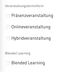 Darüber hinaus können Sie auch das gewünschte Veranstaltungsformat über diese Filter auswählen: Präsenz, Online, Hybrid sowie Blended Learning stehen zur Verfügung.