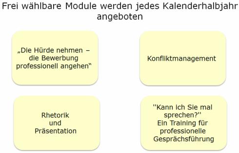 "Frauen fit für Führung" greift Erfahrungen der Führungskräfteentwicklung, Ergebnisse der Verhandlungsforschung, wissenschaftliche Erkenntnisse zum Thema Führung und Kompetenzen des Anforderungsprofils Schulleiterinnen und Schulleiter auf und umfasst folgende Angebote: