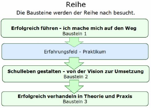In der Ausschreibung des Bausteins 1 werden die Termine der Bausteine 2 und 3 veröffentlicht. Interessierte Lehrerinnen prüfen anhand der Termine, ob Ihnen die Teilnahme an allen drei Bausteinen der Reihe dienstlich und privat möglich ist und melden sich dann mit LFB-Online zur Fortbildung "Erfolgreich führen - Ich mache mich auf den Weg" an. Diese Anmeldung umfasst bereits die verbindliche Anmeldung zu den Fortbildungen "Schulleben gestalten - von der Vision zur Umsetzung“ (Baustein 2) und "Erfolgreich verhandeln in Theorie und Praxis“ (Baustein 3). Mit dieser Anmeldung verpflichtet sich die Lehrerin gleichzeitig zum Durchlaufen des integrierten Praktikums im Umfang von 3 - 5 Tagen zwischen den Bausteinen 1 und 2.