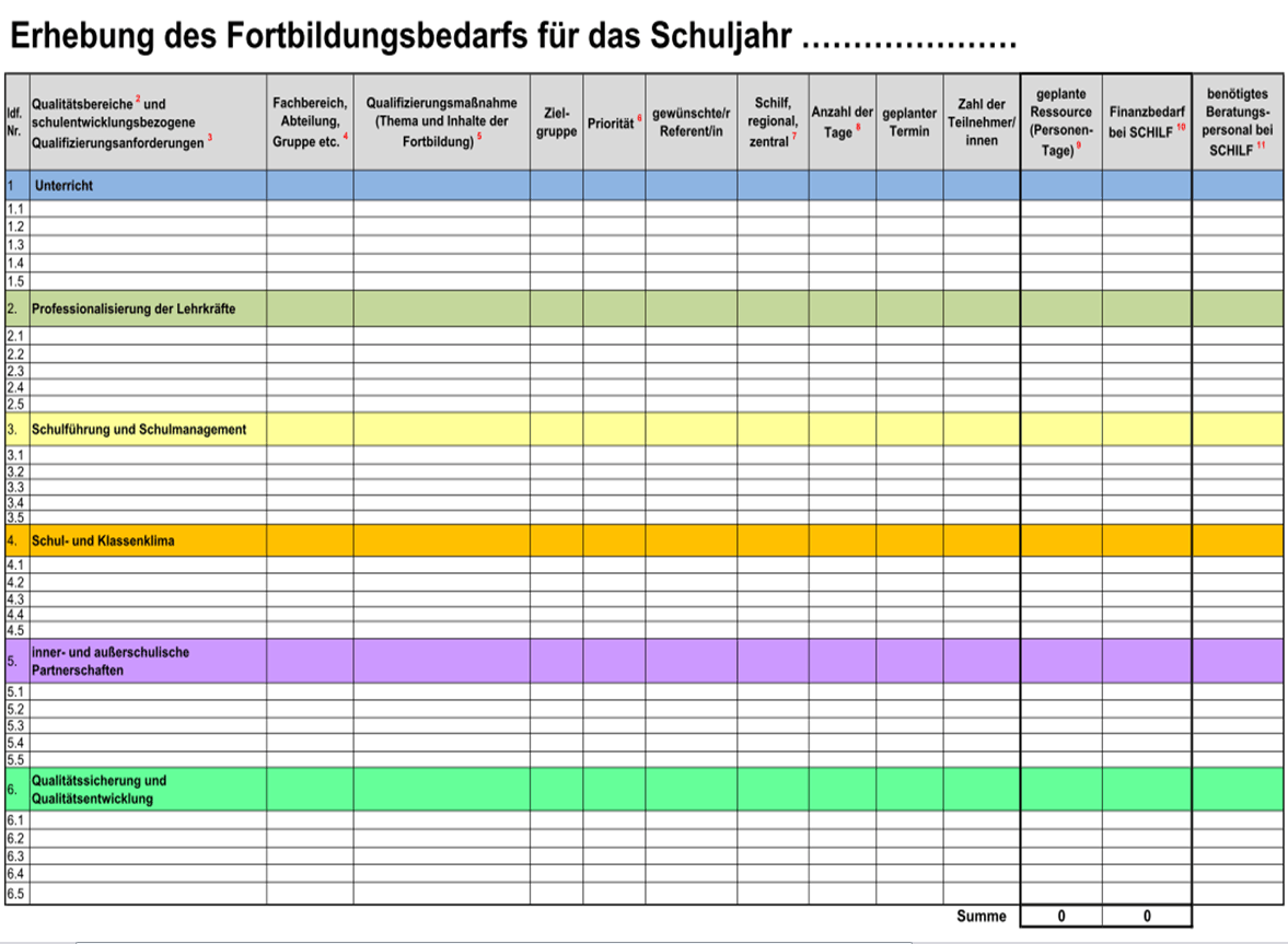 Für die Erhebung des Fortbildungsbedarfs [xlsx] können in der Schule eigene Verfahren und Formulare verwendet werden. Der Differenzierungsgrad kann auch berücksichtigen, welche Vorerfahrungen es in der Schule mit der Fortbildungsplanung gibt. So kann z.B. die Beschreibung von schulentwicklungsbezogenen Qualifizierungsanforderungen oder die Unterscheidung von Qualitätsbereichen zunächst ausgespart werden. Wichtig ist aber, dass die Angaben zu den benötigten Fortbildungen möglichst genau sind, damit die Schulverwaltung und deren Fortbildungspersonal damit bedarfsorientierte Fortbildungsangebote entwickeln können. Beispiele für solche Bedarfserhebungen mit unterschiedlichem Differenzierungsgrad finden sich in diesem Materialteil (s. Navigationsleiste).