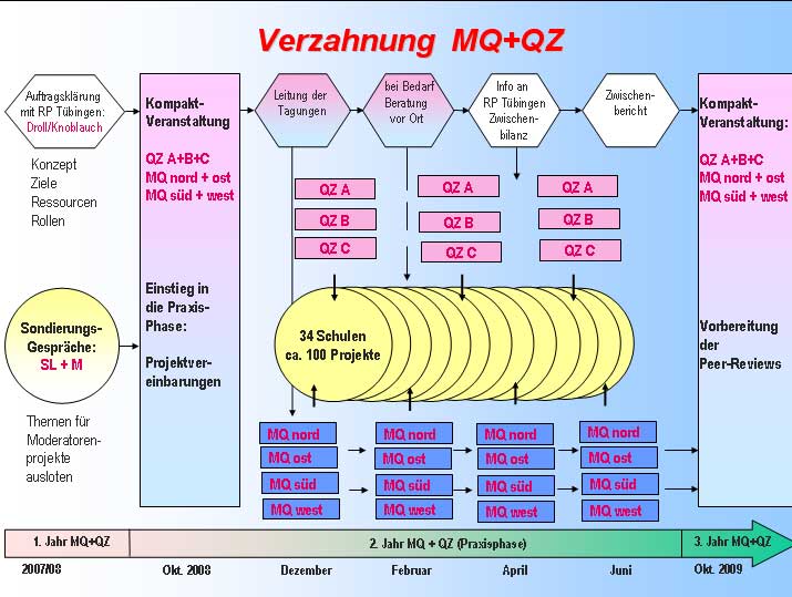 Bei der Zusammensetzung der Kurse gilt die Bedingung, dass in der Regel nur Schulen zugelassen werden, bei denen sowohl ein Team von Moderatoren als auch ein Team von Schulleitungspersonen parallel an MQ+QZ teilnehmen. Zu Beginn des 2. und 3. Jahres findet jeweils eine Kompakt-Tagung mit beiden Teilnehmerkreisen statt, um mit dem Start in die Praxisphase die bestmögliche Kooperation der beteiligten Personen an den Schulen zu gewährleisten.
