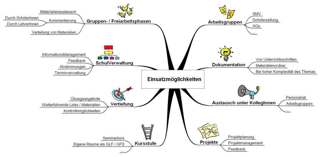 Die Einsatzmöglichkeiten von Moodle sind so vielfältig wie das System selbst. Die folgende Mindmap bietet einen ersten Überblick: als JPG [92 kb] oder als PDF [118 kb]