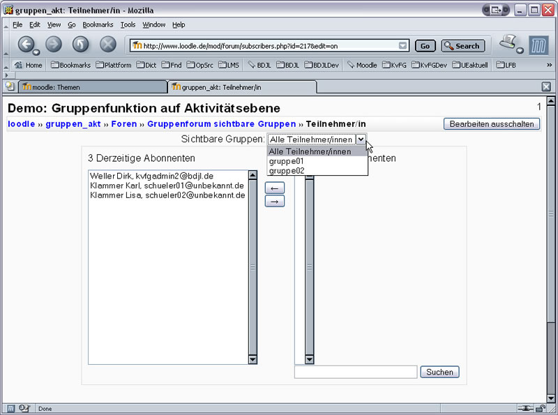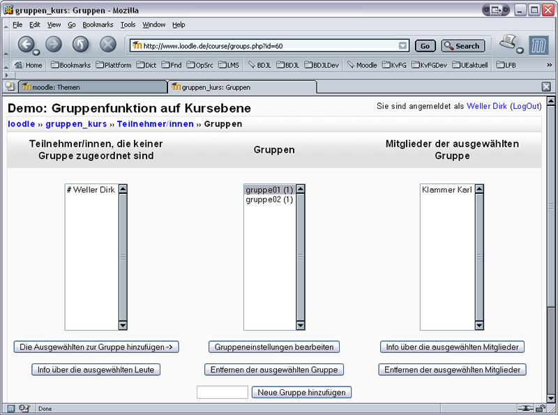 In der ersten Liste finden Sie die Teilnehmer Ihres Kursraumes, in der zweiten die eingerichteten Gruppen und in der dritten die Mitglieder der Gruppe, die Sie im zweiten Listenfeld gerade markiert haben.