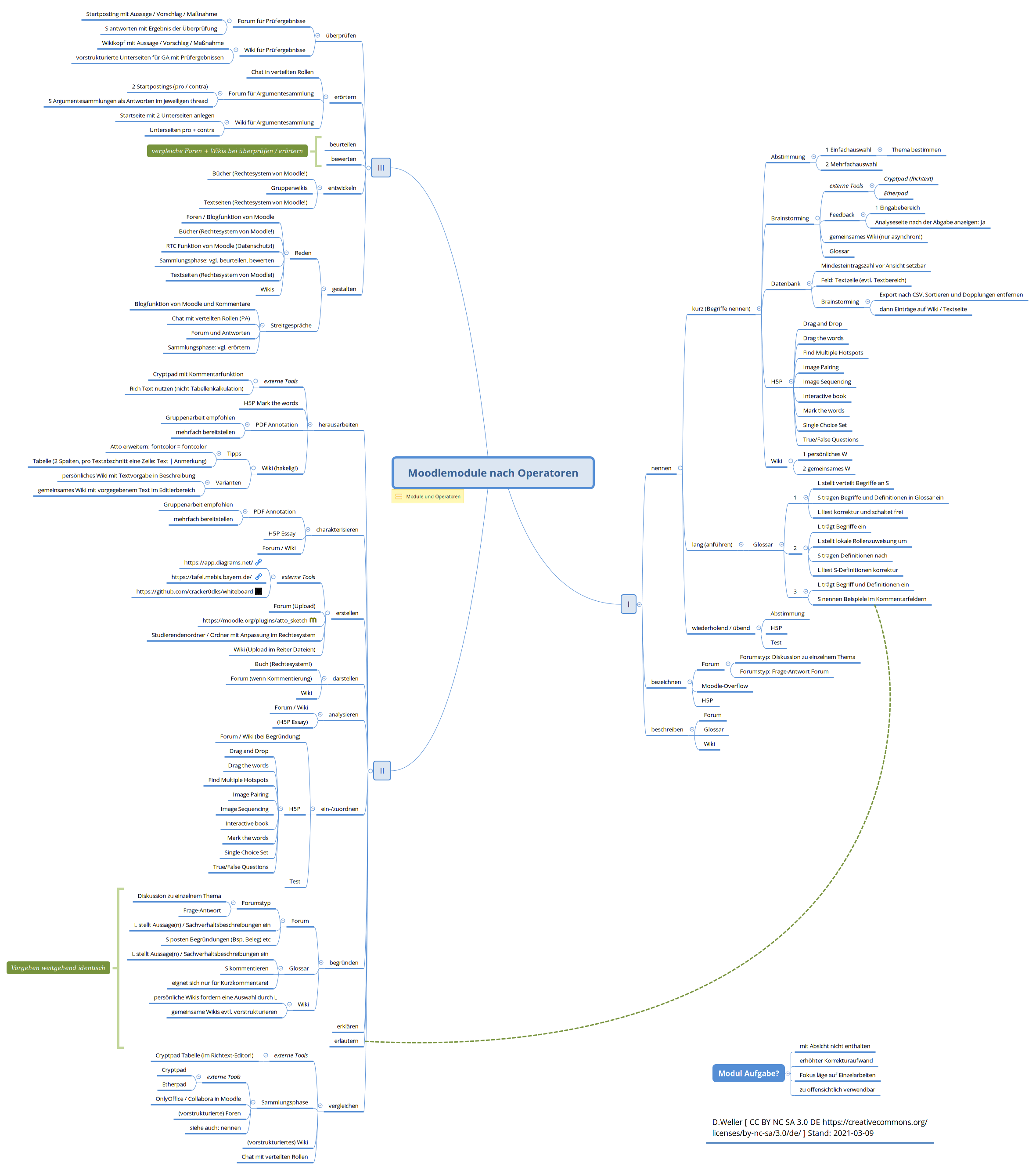 Bei einer empirischen Betrachtung unserer eigenen Kursräume fiel uns über die Zeit auf, dass bestimmte Moodle-Module besonders häufig im Kontext bestimmter Operatoren auftauchen. Die Module Forum und Wiki sind hierbei Ausnahmen: diese wurden auf fast allen Operatorenniveaus eingesetzt. Die Mindmap fasst diese Beobachtungen gliedernd zusammen.