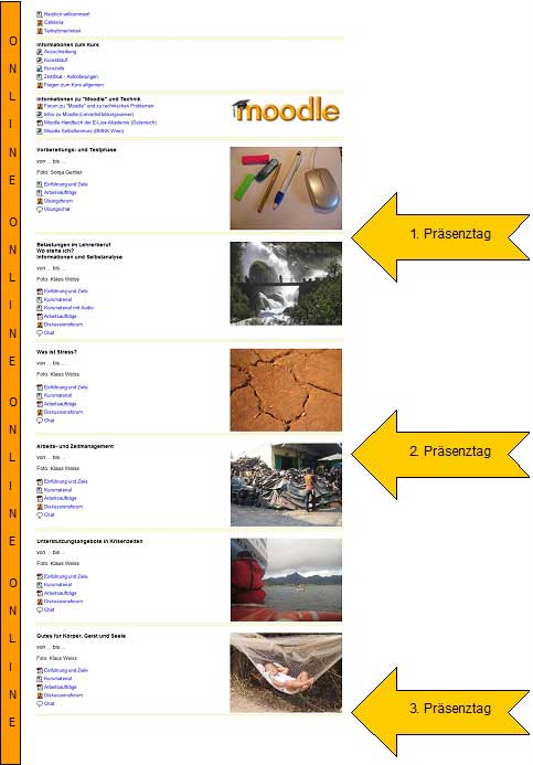 Ein Modul enthält i.d.R. fünf Themeneinheiten (Themenblöcke) und beginnt mit einer Eröffnungspräsenzveranstaltung, die vor allem dem gegenseitigen Kennenlernen dient. Auch findet eine Einführung in die Lernplattform Moodle statt, so dass die Teilnehmerinnen und Teilnehmer später von zuhause aus online agieren können.