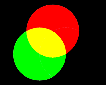 Die drei Lichtkegel (rot, grün, blau) des RGB-Systems und ihre Überlagerungen
