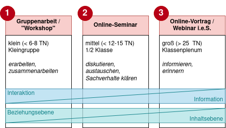 Diese Unterscheidung nach Webkonferenz-Formaten kann eine Hilfestellung geben, welche Unterrichtsziele mit welcher Gruppengröße erreichbar sind.