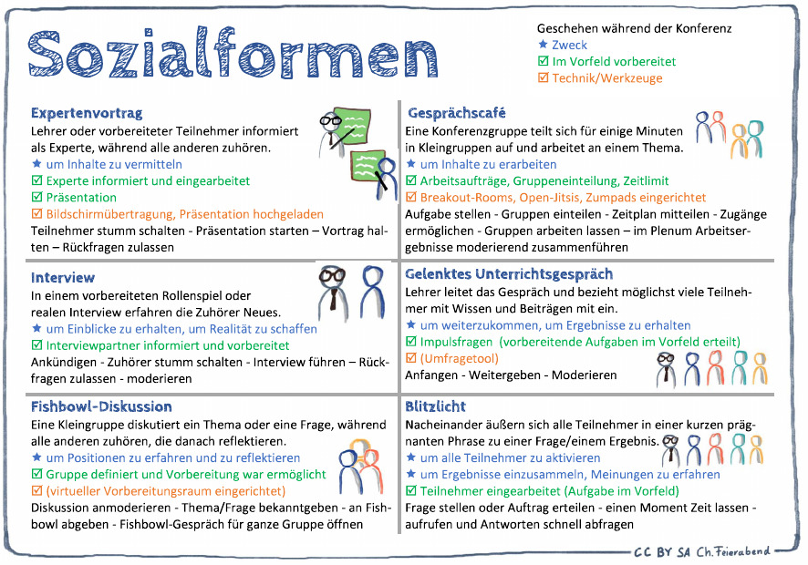 Wie auch beim klassischen Unterricht hängt das Gelingen von Onlineunterricht stark von der Wahl eines geeigneten Formats (inklusive Sozialform) und geeigneter Methoden ab.