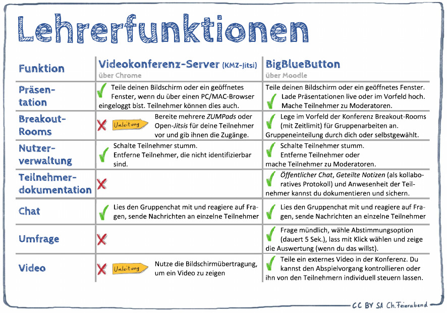 Die generelle Methodik für beide System (BigBlueButton und Jitsi Meet) wird auch im Dokument: „Wie geht eigentlich Webkonferenz?“ von Christian Feierabend beschrieben: