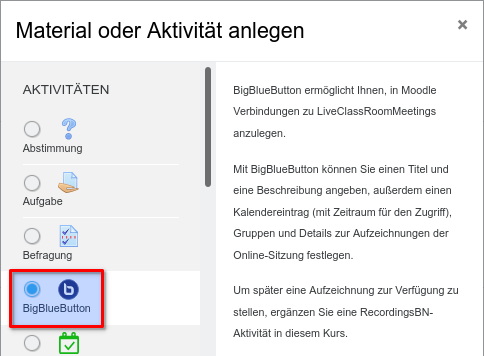 Wählen Sie die Aktivität „BigBlueButton“ und bestätigen Sie mit „Hinzufügen“.