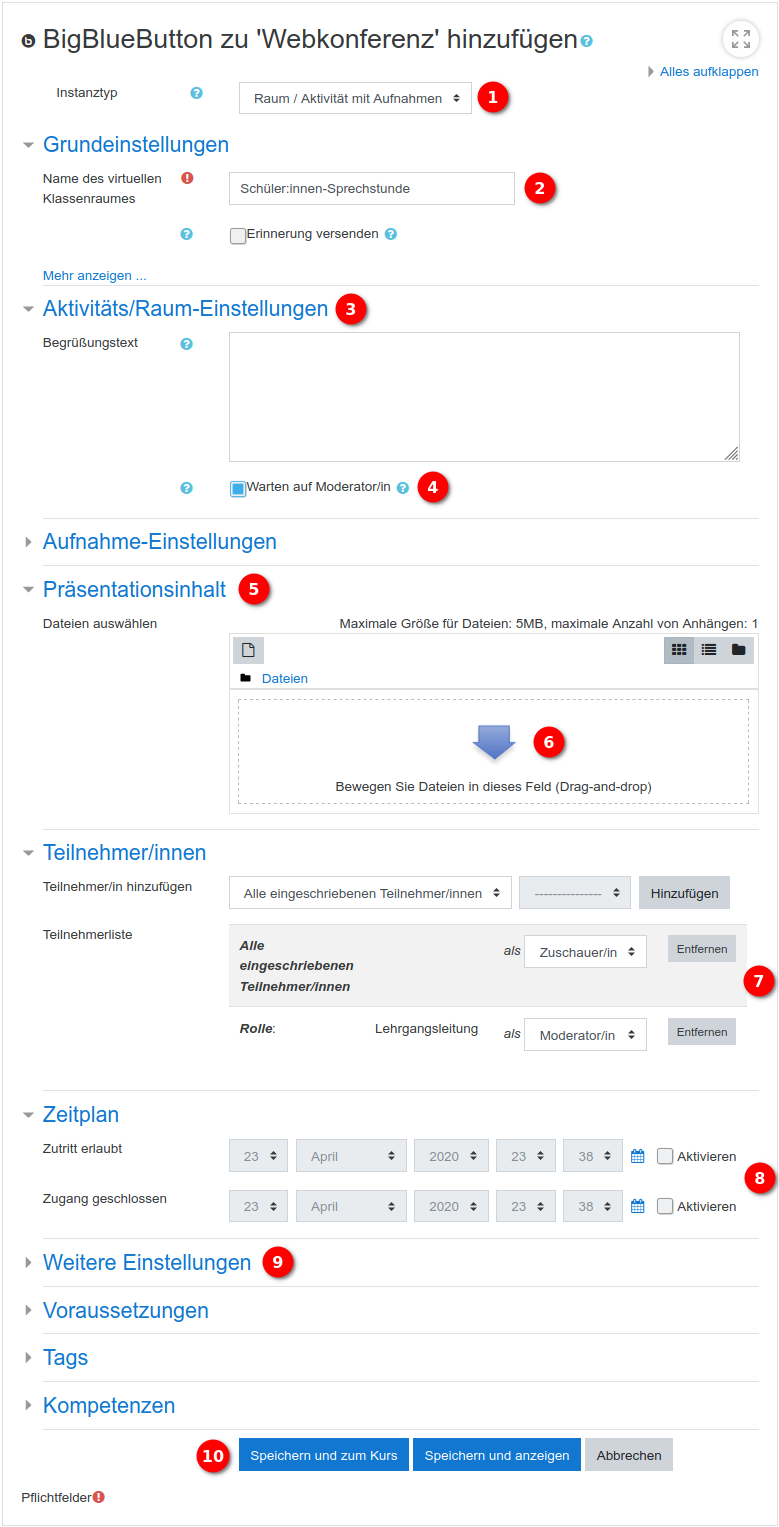 - ❽ Über die Einstellungen des Zeitplans kann man den Zugang zu einem Webkonferenzraum zeitlich begrenzen. Sind diese Einstellungen nicht aktiviert, gibt es keine Einschränkung.