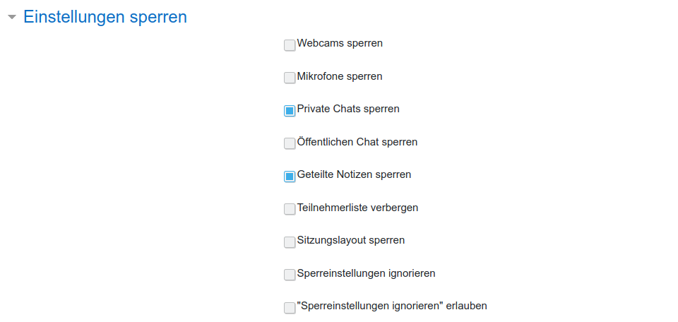 Es wird empfohlen die „geteilten Notizen“ sowie die „privaten Chats“ standardmäßig zu deaktivieren, wie in der nachfolgenden Abbildung demonstriert. Eventuell ist das im jeweiligen Schulmoodle auch schon so voreingestellt.
