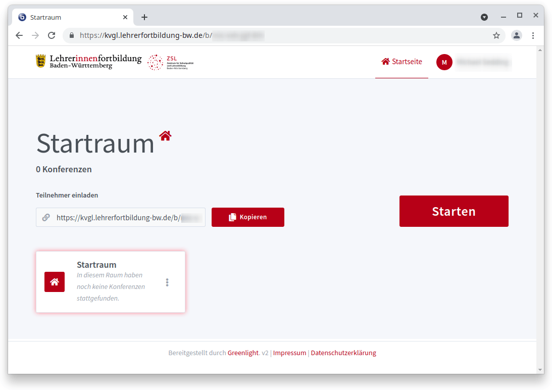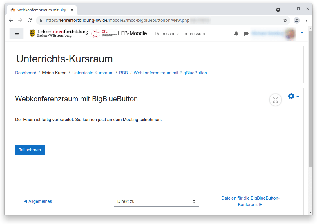 In der Folge werden Sie zum Konferenzraum weitergeleitet. Diese Weiterleitung erkennen Sie daran, dass in der Adresszeile des Browsers nun eine Adresse der Landesinfrastruktur BigBlueButton zu sehen ist. Diese beginnt beispielsweise mit https://bbb111-001.lehrerfortbildung-bw.de/, wobei die grau dargestellten Ziffern variieren. Diese Ziffern bezeichnen die Servernummer.