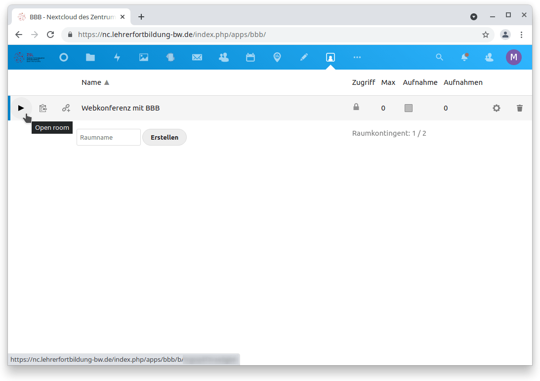 Mit einem Klick auf einen Button starten Sie die Konferenz, beziehungsweise treten der Konferenz bei. Bei Moodle und Greenlight ist der entsprechende Button nicht zu übersehen und mit „Teilnehmen“ bzw. „Starten“ beschriftet. In einer Nextcloud wird der Button mit einem Abspiel-Symbol (🞂) dargestellt und befindet sich am linken Rand des Browserfensters.