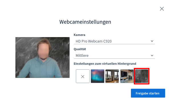 Im folgenden Fenster wählen Sie nun die Kamera und die Videoqualität. Die empfohlene Einstellung hier ist „Mittlere Qualität“. Zusätzlich kann man noch eine sog. „virtuellen Hintergrund“ auswählen. Dadurch wird der echte Hintergrund vorschwommen dargestellt bzw. mit einem Bild kaschiert. In der Abbildung wurde der Tafelhintergrund (rot markiert) gewählt
