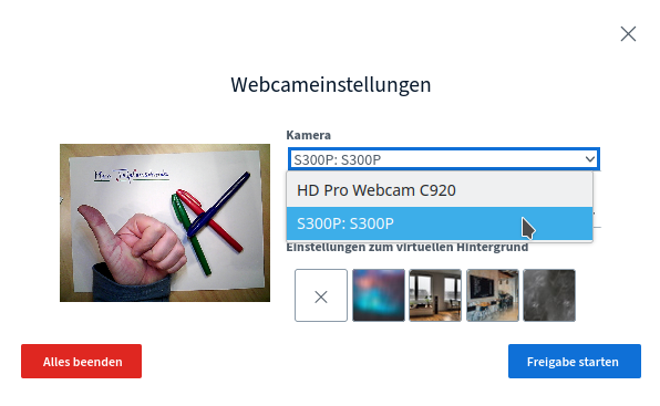 Wählen Sie die zweite Kamera im Dropdown-Menü des Einstellungsfensters aus, bestimmen Sie Qualität und wählen Sie eventuell einen virtuellen Hintergrund. Bestätigen Sie die Fragabe über den Button unten rechts.