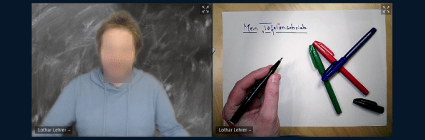 Seit Version 2.3 von BigBlueButton kann ein_e Konferenzteilnehmer_in mehrere Webcams freigeben. Diese eröffnet interessante Möglichkeiten für den Unterricht. So kann z.B. zusätzlich zum Kamerabild der Lehrkraft noch der „Tafel“-Anschrieb geteilt werden, oder eine weitere Kamera kann den Versuchsaufbau eines physikalischen Experiments im Detail zeigen.