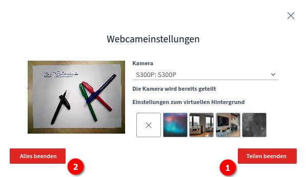 Zum Beenden der Kamerafreigabe wird das Einstellungsfenster wieder über das kleine Dreieck am Kamerasymbol geöffnet. Ein Klick auf „Teilen beenden“ ❶, deaktiviert die aktuell ausgewählte Kamera. „Alles beenden“ stoppt die Übertragung aller Kameras ❷.