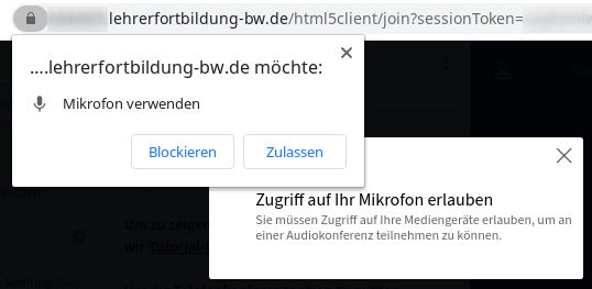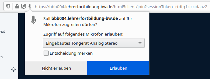 Während des Echotests die Berechtigung zur Nutzung des Mikrofons erteilen. Sollten Sie später die Kamera einschalten oder einen Bildschirm/ ein Fenster freigeben wollen, wiederholt sich die Berechtigungsabfrage.