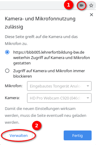 Auch im Nachhinein lassen sich unter Chrome die Berechtigungen noch ändern. Mit einem Klick auf das Kamerasymbol rechts neben der Adresszeile ❶ und anschließendem Klick auf „Verwalten“ ❷ .