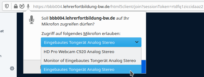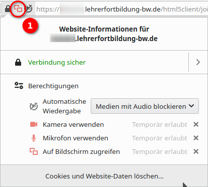Auch im Nachhinein lassen sich unter Firefox die Berechtigungen noch ändern. Mit einem Klick auf das blinkende Symbol ❶ (Mikrofon, Kamera oder Bildschirmfreigabe) links unterhalb der Adresszeile.