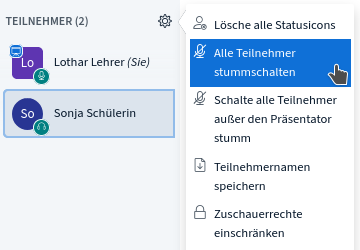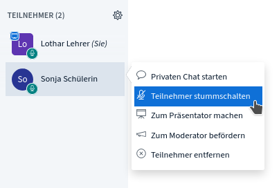 Mit einem Rechtsklick auf den Namen in der Teilnehmerliste kann ein Moderator bzw. eine Moderatorin kann auch einzelne Teilnehmer_innen stummschalten oder sogar aus der Sitzung ausschließen. Zudem kann oder ihm bzw. ihr eine andere Rolle (Moderator/Präsentator) zugewiesen werden.