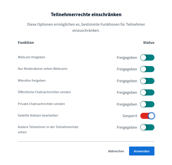 Besonders interessant ist dabei der Menüpunkt „Zuschauerrechte einschränken“. Hier können einzelne grundlegende Funktionen für den BBB-Konferenzraum blockiert bzw. freigegeben werden.