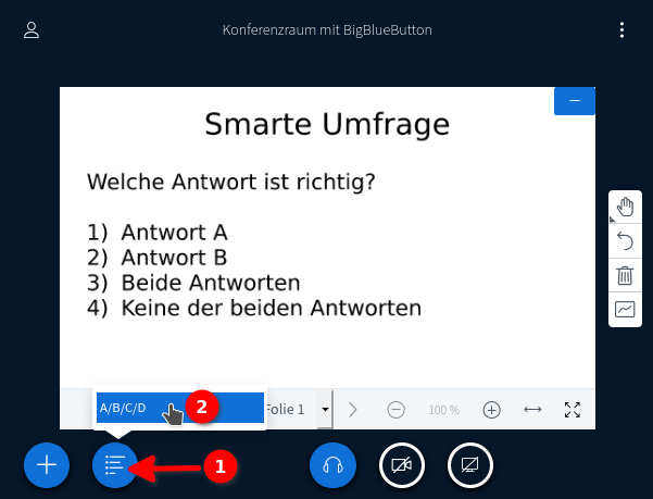 Erkennt BBB eine Aufzählung in der hochgeladenen Präsentation, bietet das System einen weiteren Knopf „Schnellumfrage“ an, wie im nebenstehenden Bild unter ❶ zu sehen. Dort kann direkt die passende Umfrage ❷ gestartet werden.