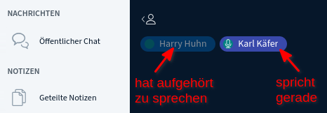 Teilnehmende, welche gerade sprechen, werden mit einem hellen Indikator dargestellt. Hat der/die Betreffende aufgehört zu reden bleibt der Indikator noch kurz abgedunkelt stehen, bevor er wieder verschwindet. Auf diese Weise kann der/die Störende einfach identifiziert werden.