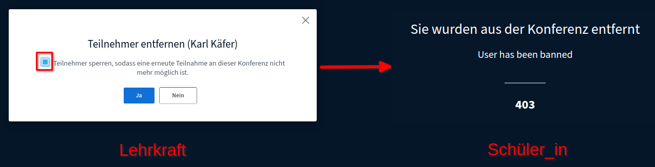 Setzt man den Haken bei „Teilnehmer sperren, sodass eine erneute Teilnahme an dieser Konferenz nicht mehr möglich ist.“ nicht, kann der/die Betreffende umgehend zurückkehren.