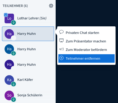 Die „doppelten“ Schüler_innen wie oben beschrieben aus der Konferenz zu entfernen, ist keine gute Lösung. Die Funktion „Teilnehmer entfernen“ entfernt mit nur einem Klick sowohl die „Duplikate“ als auch den tatsächlichen Schüler.
