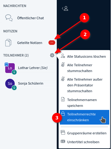 Dies kann man – auch ad hoc – unter dem Punkt „Teilnehmerrechte einschränken“ ❸ einstellen, der nach Klick auf das Zahnrad-Icon ❷ oberhalb der Teilnehmerliste erscheint.
