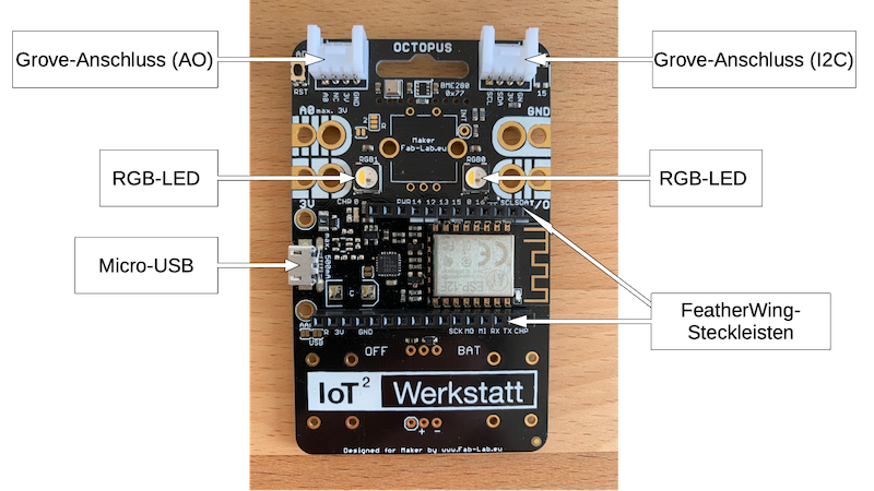 Herzstück des Projekts ist die Platine "IoT Octopus". Sie ist bereits mit einem WLAN-Mikrocontroller, einem Umweltsensor für Temperatur, Luftfeuchte, Luftdruck und Luftqualität, zwei LEDs, Steckplätzen für Erweiterungen und einer Reihe weiterer Anschlüsse ausgestattet.