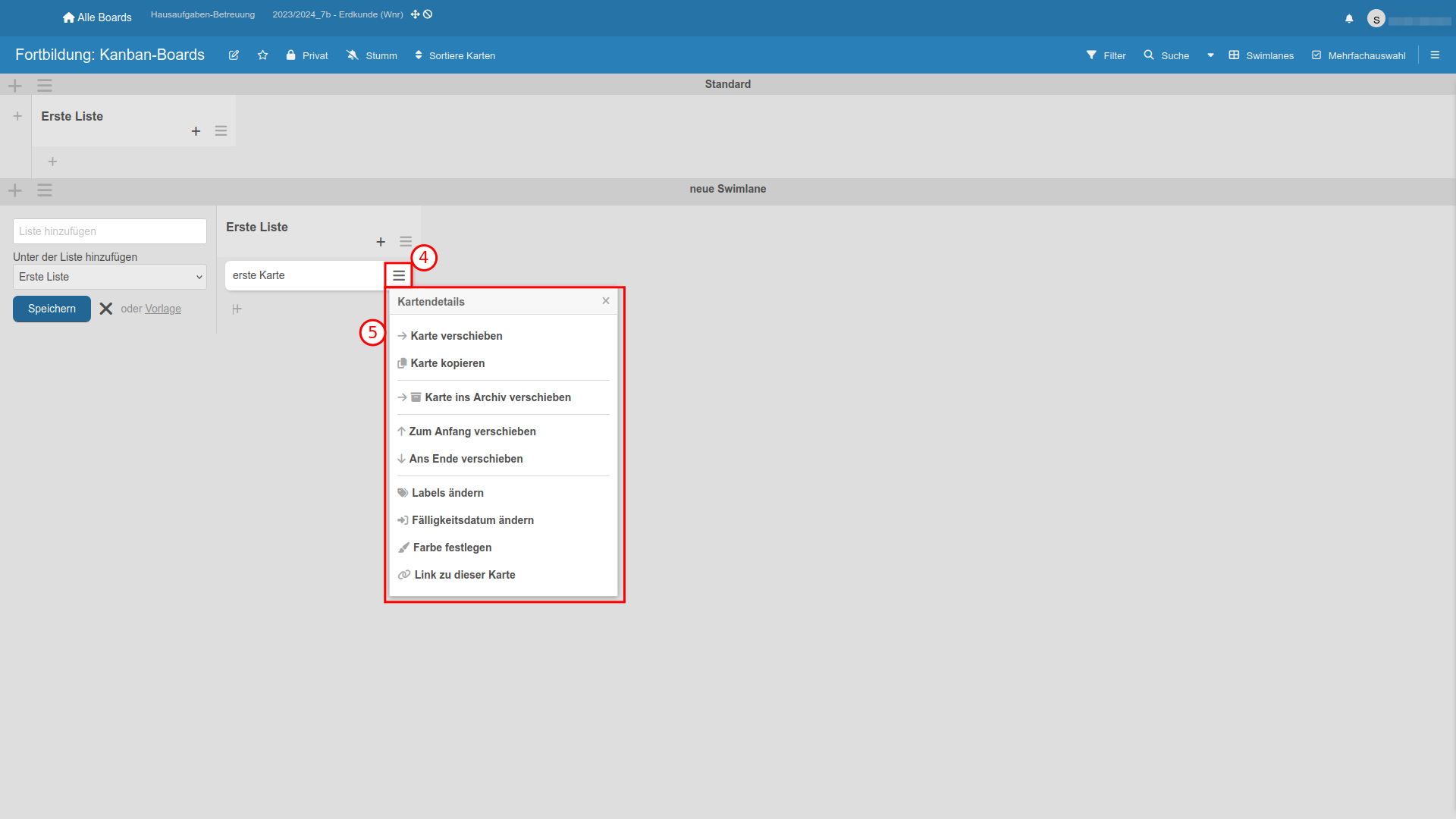 Die Swimlanes, Listen und Karten können per Drag-and-Drop im ganzen Board verschoben werden. Das Verschieben und Kopieren von Karten ist auch zwischen den verschiedenen Boards möglich.