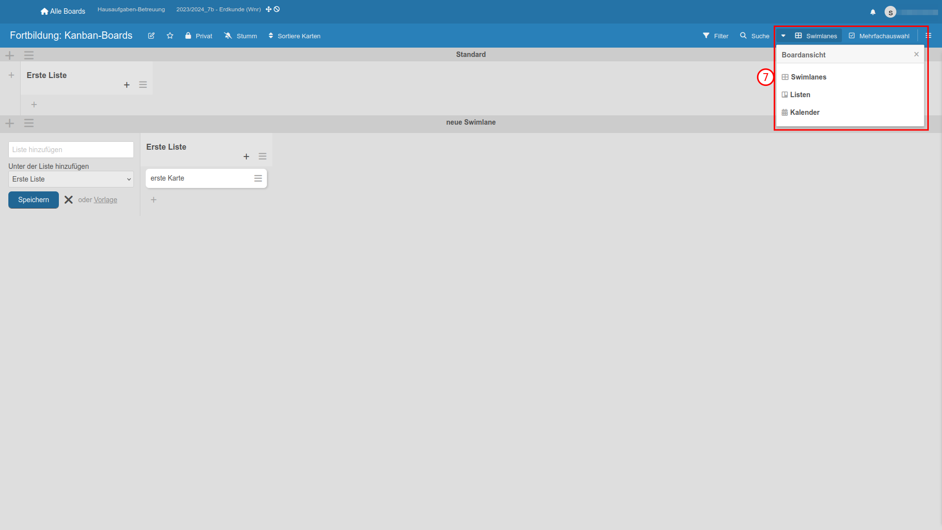 Boards lassen sich in Bezug auf die ➏ Kartensortierung innerhalb der Listen einstellen: z.B. alphabetisch nach Titel oder aber nach Datum.