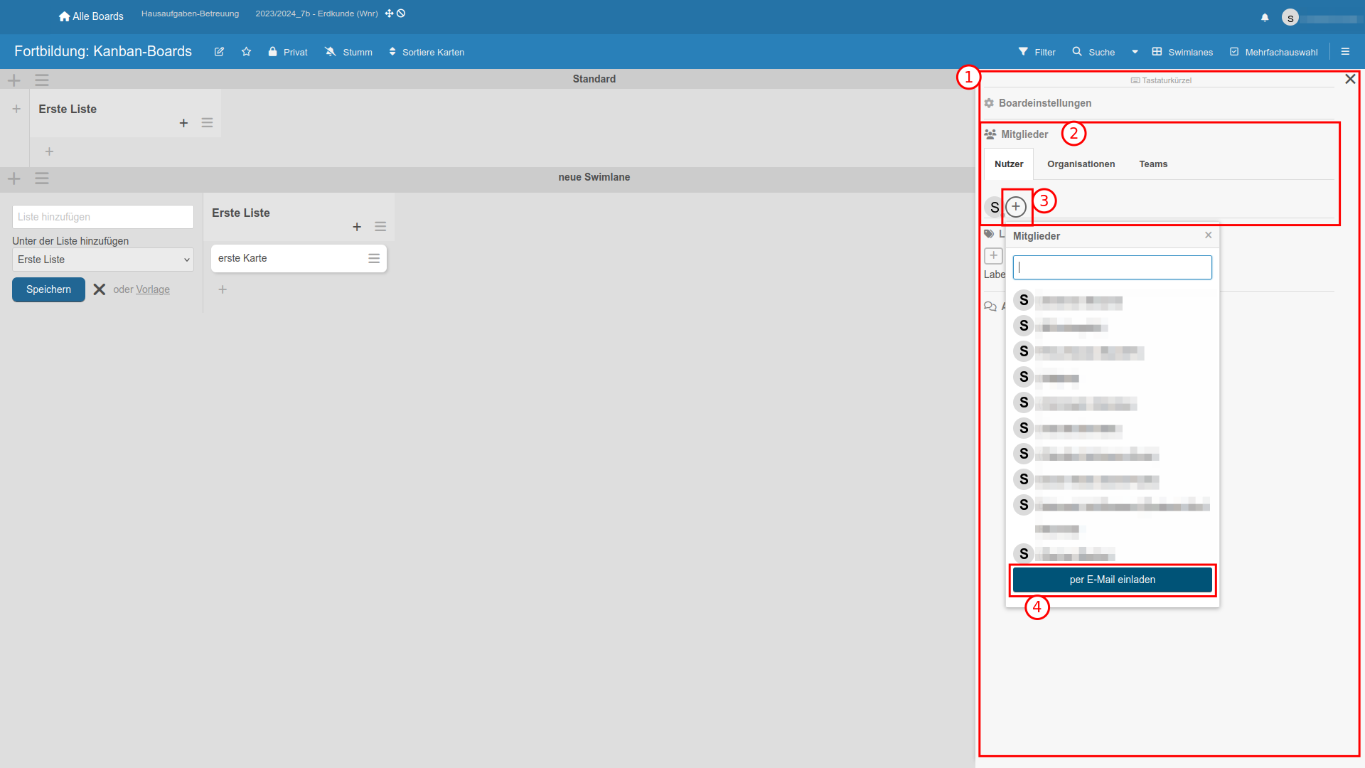 In der ➊ Seitenleiste kann man ➋ Mitglieder, ganze Teams oder sogenannte Organisationen der gleichen WeKan-Instanz dem jeweiligen Board zuordnen. Mit einem Klick auf das ➌ Pluszeichen öffnet sich ein Suchfeld, in dem man nach Benutzern suchen, diese auswählen und dann ➍ „per E-Mail einladen“ kann. Sind einmal schulweit Teams definiert, so z.B. „Kollegium“ oder „Fachschaft Mathematik“, können alle Lehrer des Teams mit einem Klick hinzugefügt werden.