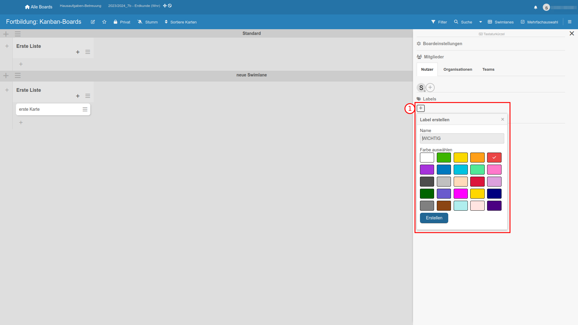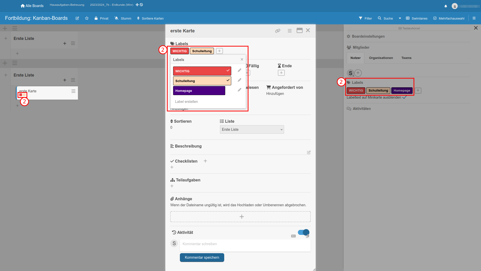 Die ➋ Vergabe mehrerer Labels pro Karte ist problemlos möglich und erlaubt einen schnellen Überblick über den Status der jeweiligen Karte. In der ausführlichen Kartenansicht kann man im Bereich „Labels“ die jeweils zur Verfügung stehenden Labels nach Klick auf das Pluszeichen aktivieren (mit Häkchen markiert) oder deaktivieren (kein Häkchen). Labels können z.B. Klassen(stufen), Projektfortschritte, Schwierigkeitsgrade und je nach Bedarf auch vieles mehr markieren.
