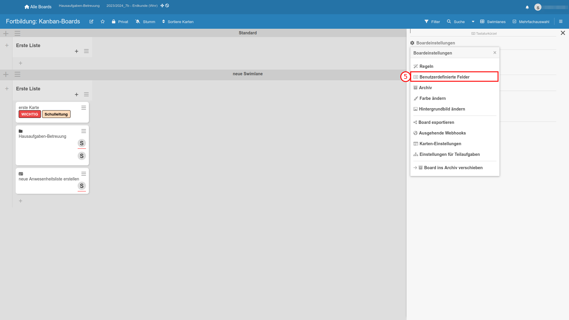 Somit lassen sich in der Schule besser einsetzbare, da besser verständliche Boards und vereinheitlichte Karten erstellen. In Bezug auf die schulspezifischen, benutzerdefinierten Felder gibt es kaum Begrenzungen. Ob Anzahl der betroffenen Schüler bei Exkursionen (Zahl), Dokumentation des eingeholten Einverständnisses (Kontrollkästchen) oder Statuseintragungen (Dropdownliste).