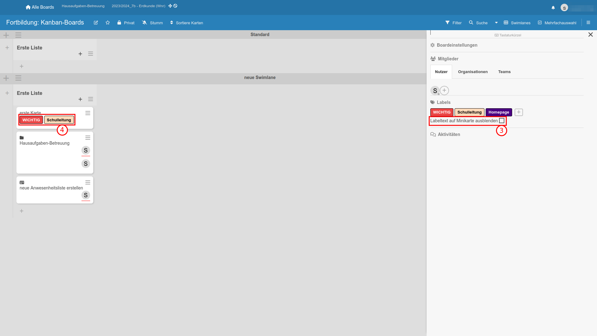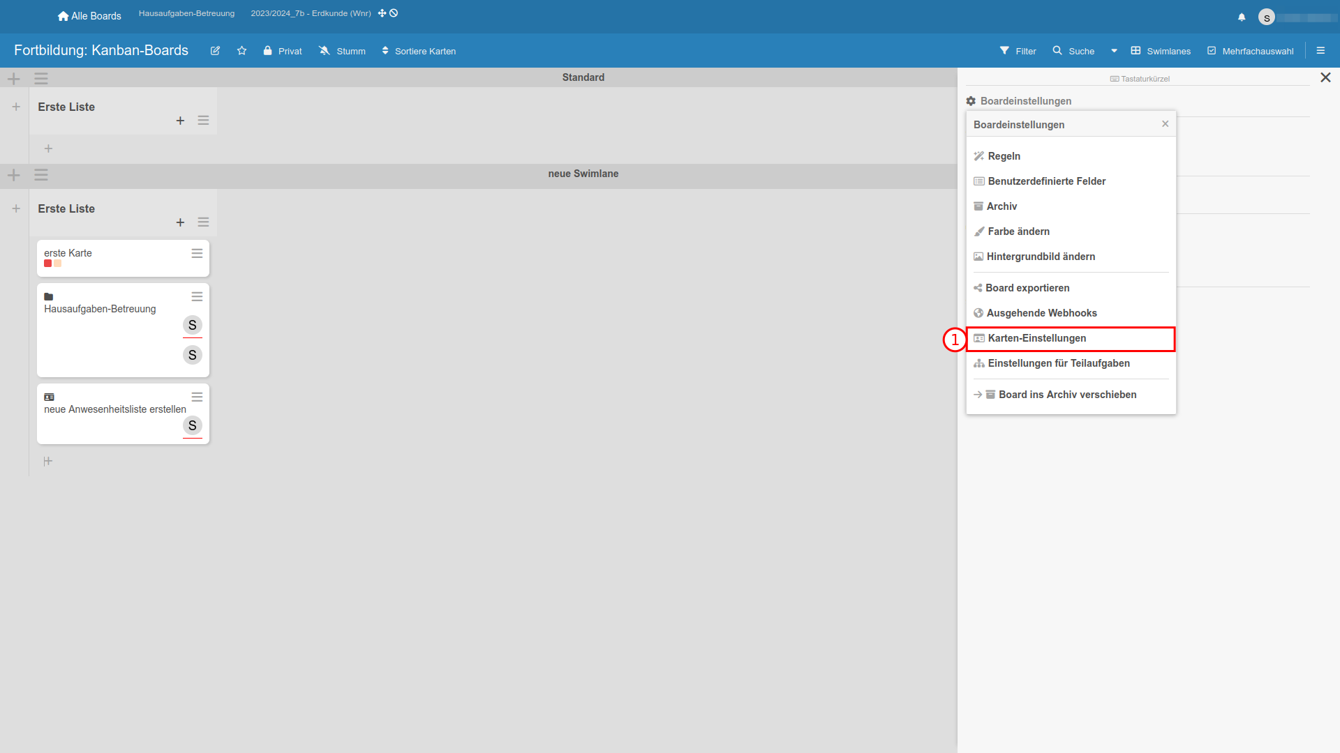 Für schulische Zwecke sind die vielen Felder der detaillierten Kartenansicht oft nicht passend. Deshalb kann man für eine bessere Übersichtlichkeit Karten über die Seitenleiste und dort unter ➊ „Boardeinstellungen“ an individuelle Bedürfnisse anpassen, indem man auf „Karten-Einstellungen“ klickt.