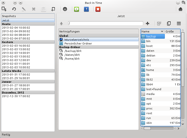 Back in Time erstellt zeitgesteuert Abbilder ausgewählter Verzeichnisse oder des gesamten Systems. Dabei werden nur die Dateien dem Backup hinzugefügt, die sich seit der letzten Sicherung verändert haben - unveränderte Dateien werden als Hardlink angelegt, der selbst keinen Speicherplatz braucht. Mit diesem Konzept wird die Wiederherstellung erleichtert, weil man im Fehlerfall schlicht den kompletten Ordner des letzten Backups zurückspielt.