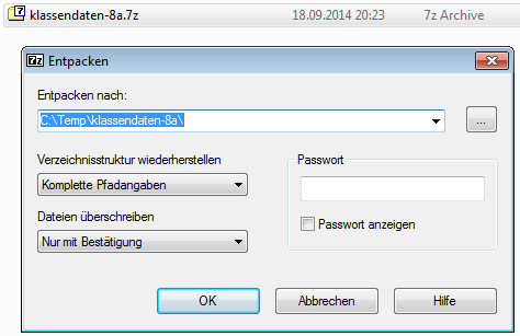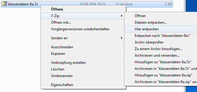 Im einfachsten Fall wählen Sie im Kontextmenü " Hier entpacken ... ". Daraufhin wird das Archiv automatisch in dem Ordner entpackt, in welchem sich die Archivdatei befindet. Nachfolgend sehen Sie das für das Archiv " klassendaten-8a.7z "