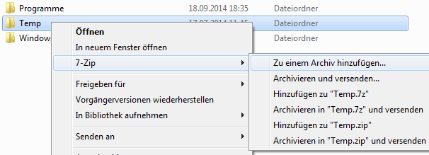 7-Zip integriert sich in das Kontextmenü des Windows Explorers. Um Dateien bzw. Ordner zu komprimieren, wählen Sie diese mit der Maus aus und klicken dann mit der rechten Maustaste auf den zu packenden Ordner oder die zu packende Datei . Dabei öffnet sich das sogenannte Kontextmenü und zeigt das folgende Bild: