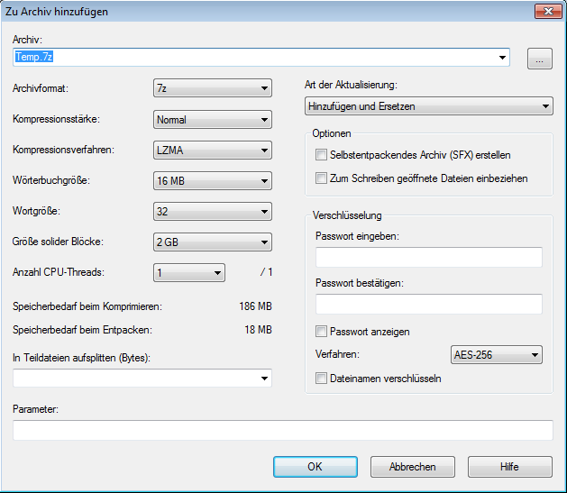 Alle weiteren Einstellungen lassen Sie unverändert. Abschießend klicken Sie auf den Button OK und erhalten Ihre gepackte Datei.