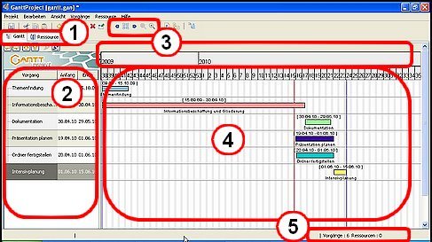 Im ersten Bereich haben Sie die Möglichkeit verschiedene Ansichten zu wählen. Es stehen das "Gantt-Balken - Diagramm" (Vorgangsbalken), das Ressourcendiagramm und optional ein so genanntes PERT-Diagramm zur Verfügung.