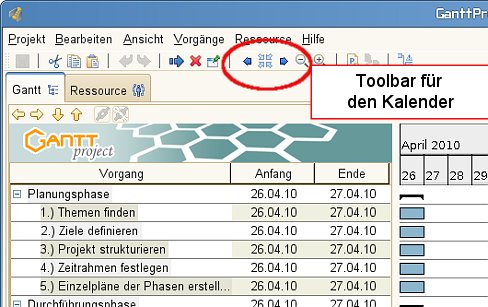 Liegen Anfang und Ende einer Projektphase außerhalb der Anzeige, so lassen sich die Balken mittels der blauen Kalender-Pfeiltasten entsprechend verschieben. Außerdem kann die Skalierung der Anzeige über die Plus-Minus-Lupe über acht Stufen hinweg angepasst werden. Auch das direkte Anklicken der Kalender-Kopfzeile und anschließendes Verschieben mit der Maus ist dabei in die Programmfunktionen integriert. Bei Verwendung des Buttons mit den vier Pfeilen wird der Kalender über den gleichzeitig ausgewählten Vorgängen zentriert.